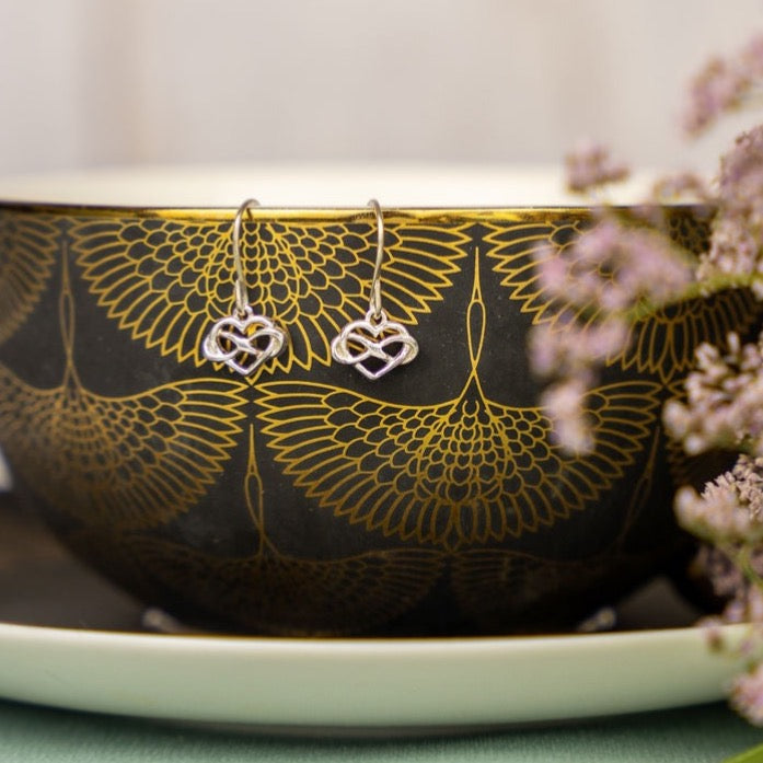 These earrings are made of a 925 Silver Infinity Heart charm connected to our signature handmade ear wires also made of Sterling Silver.